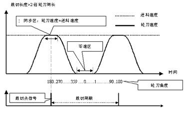 3. 当裁切刀离开同步区域后,裁刀速度曲线经过控制系统精确的计算、控制,在降低到零速的同时,裁刀方位角也必须刚好等于0度。
