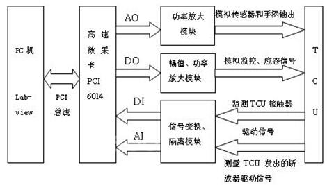 TCU测试系统是以PC机为核心,应用NI公司的高速数据采集卡PCI-6014实现的数据采集控制系统。 TCU测试系统结构如图2所示。PC机为控制系统的核心单元,用于发出控制指令,同时采集反馈信息。PCI-6014是基于PCI总线的16位多功能高速数据采集卡,提供16路单端或8路差分模拟输入,2路16位模拟输出,最高采样率是200kS/s。同时提供8路数字1/0线和2个24位计数器/定时器。PCI-6014附带NI-DAQ驱动软件,提供Labview语言的强大编程接口,使用方便。