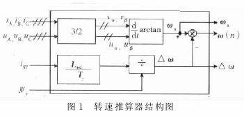 所谓无速度传感器变频调速控制系统就是取消了变压变频调速系统的速度检测装置,通过间接计算法求出列车运行中牵引电机的实际转速值作为转速的反馈信号。我们把计算转速实际值的这一模型称之为转速推算器。它的基本组成原理是: 在电机的定子侧装设电压传感器和电流传感器,通过检测三相电压 uA,uB,uC 和三相电流 iA,iB,iC。根据 3/2 变换( 矢量控制中三相轴系到二相轴系的变换) 静止轴系中的两相电压 usα,usβ 及两相电流isα,isβ,由定子静止轴系( α- β) 中的两相电压、电流可以推算定子磁链,估算电机的实际转速。转速推算器的结构如图 1 所示。