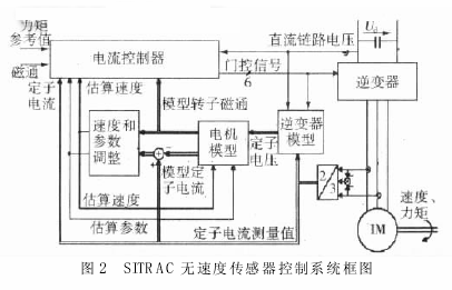 图 2 是 SITRAC 无速度传感器控制系统的框图。此控制模型图解了一个完整的逆变器模型,图中的电机模型是用来为电流控制器计算机械设备模型的定子电流和磁通空间矢量。电机模型的输入仅仅是定子电压空间矢量和估算速度以及同样是估算值的机械参数。在这个系统中电机电压不是由测量得到而是通过逆变器门控信号、直流电压测量值、电机电流和相关的 IGBT 参数重新构建。电机速度是通过电流空间矢量测量值和模型定子电流空间矢量进行比较而估算得到。