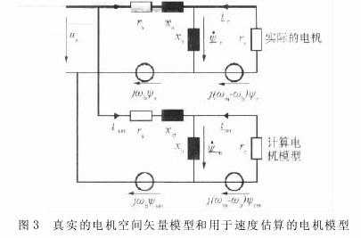 在无速度传感器的牵引系统中,为了识别速度必须建立一个电感设备的精确模型,这个模型依靠计算所得的定子电压和估算所得的电机参数来估算电机磁通和定子电流空间矢量。由于这个电机模型必须准确地用相关的模块来描述,因此这个电机的模型参数也就必须随着饱和度及定子绕组和转子绕组的温度变化而得到调整。在稳态的情况下,定子电流空间矢量测量值和估算值之间的差值能独立地用来估算电机的参数。定子频率接近零时,只是理论上可以估算出稳定的速度。实际上,模型参数和实际系统之间的差值是不可避免的,为了进行速度估计有必要设一最小定子频率 fsmin。为了使这一定子频率 fsmin 最小化,电机模型与实际电机( 见图 3) 之间的定子阻抗及定子电压差值必须保持尽可能的小。在低频情况下,基本的定子电压空间矢量的幅值相对比较小,所以定子阻抗或逆变器电子管建摸的误差对速度的估算有很大的影响。