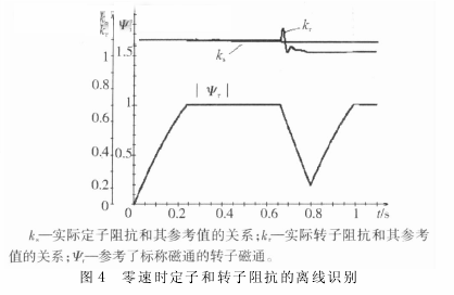 在每一次停站( 速度为零) 时,通过一个短时的测量来进行定子和转子阻抗的识别,这样就有可能以精确的电机参数来对列车进行下一次的启动。这里,定子阻抗的估算是通过励磁之后( 图4 中: 0.2 s)