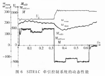以下利用 SITRAC 牵引控制系统的优良动态性能对典型测量进行了处理。图 6 说明了在力矩参考值阶跃( 较小阶跃: 15% 正常力矩; 较大阶跃: 100% 正常力矩) 改变的情况下 SITRAC 的力矩控制品质; 此外它还说明了即使直流线电压快速改变,SITRAC 也能够精确控制力矩,这也是铁路应用中满足运行的基本特征。