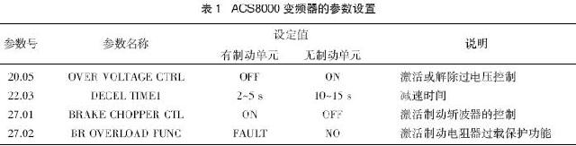 变频器的几个关键参数设置与控制系统是否选用制动单元有关,下面以ABB 公司ACS800变频器参数设置为例做以对照,如表1 所列。