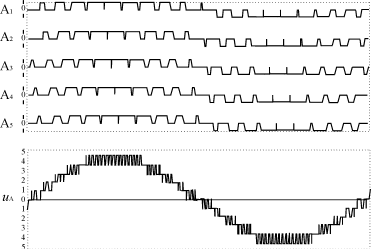 图3中的每个功率单元都是由低压绝缘栅双极型晶体管(IGBT)构成的三相输入,单相输出的低压PWM电压型逆变器。功率单元电路见图4。每个功率单元输出电压为1、0、-1三种状态电平,每相5个单元叠加,就可产生11种不同的电平等级,分别为±5、±4、±3、±2、±1和0。图5为一相合成的正波输出电压波形。用这种多重化技术构成的高压变频器,也称为单元串联多电平PWM电压型变频器,采用功率单元串联,而不是用传统的器件串联来实现高压输出,所以不存在器件均压的问题。每个功率单元承受全部的输出电流,但仅承受1/5的输出相电压和1/15的输出功率。变频器由于采用多重化PWM技术,由5对依次相移12°的三角载波对基波电压进行调制。对A相基波调制所得的5个信号,分别控制A1~A5五个功率单元,经叠加可得图5所示的具有11级阶梯电平的相电压波形,线电压波型具有21阶梯电平,它相当于30脉波变频,理论上19次以下的谐波都可以抵消,总的电压和电流失真率可分别低于1.2%和0.8%,堪称完美无谐波变频器。它的输入功