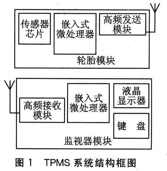 轮胎压力监测系统(TPMS)的工作是通过射频收发来实现的,由轮胎模块和监视器模块组成。图1为其系统结构框图。