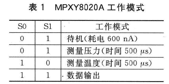 传感器选择Motorola公司的压力/温度传感器MPXY8020A。它是一种表面微机械型电容性微机电系统(MSMS)压力传感器。其特点有:专门的TPMS气压和温度传感器、CMOS工艺、低功耗、3 V工作电压、带有MCU唤醒功能的集成低频振荡器、8位数字输出;全部功能集成在单一芯片上,降低了功耗,适合条件要求苛刻的电池供电系统;测压范围为一40℃~+125℃,测温范围为0~637 kPa;它具有4种工作模式,即待机/复位、压力测量、温度测量和数据输出。用户可以通过设置S0和S1引脚选择相应的模式,如表1所列。由表1可以发现,MPXY8020A在不同的工作模式下,需要的工作电路不同,从而达到降低功耗的目的。