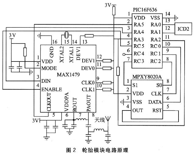 轮胎模块由传感器、微处理器、发射芯片、电池和天线组成。因为此模块要嵌入到轮胎内,所以模块的超小型和节电设计是最关键的问题。