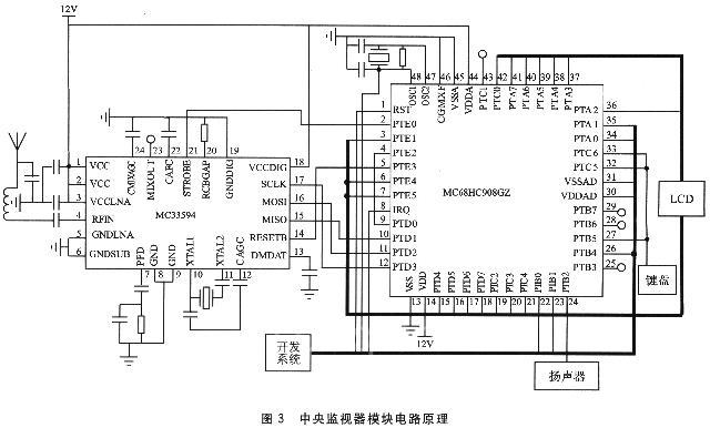 图3所示为中央接收处理模块的电路原理。数据管理器支持MC33594与GZ16控制器通信,可以键盘输入轮胎压力的阈值,各个轮胎的压力值与温度值通过液晶显示更加直观。当轮胎充气压力出现异常时,蜂鸣器与发光二极管进行声光报警,由液晶屏上相应的轮胎图像闪烁提示。
