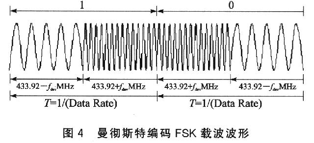 本设计中,TPMS的信号采用曼彻斯特编码,调制方式为FSK。它的“1”和“0”位对应的频率变化如图4所示(fdev为频率偏移值)。