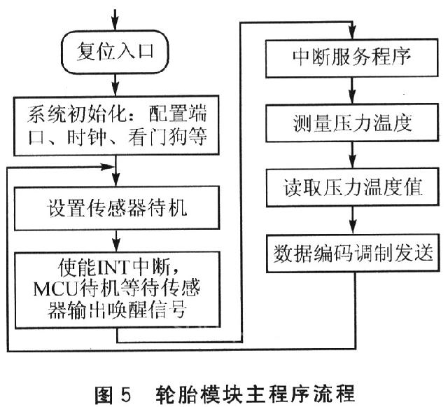 上电复位后,首先设置传感器工作在STANDBY模式下,然后MAX1479进入STOP模式。在此种模式下,OUTPUT引脚每3 s输出一次下降沿,触发PIC16F636的外部中断,从而唤醒PIC16F636,使其脱离STOP状态,进入中断服务程序。在中断服务程序中进行数据采集和发射控制处理。如果采集值是一个新的最大或最小值(处于发送周期内)就存入RAM,否则就把计数器加1再返回停止模式。在连续10次唤醒后(30 s),模块把它的状态发送给接收机。模块分析存储的胎压最大值和最小值间的差异,如果这个差值超过了存储在ROM中的最大差值(△max),模块111`就进入快速发送模式,每隔800~900 ms发送255个数据帧。MAX1479使用曼彻斯特编码方式来发送射频数据。发射完成之后再重新允许外部中断,让传感器进入STANDBY模式,PIC16F636、MAX1479 同时进入STOP模式,以降低功耗,延长电池的使用寿命。PIC16F636工作在内部晶振模式下,可以增加其抗干扰能力。传感器的RST信号每隔52 min复位1次PIC16F636,以进一步提高系统的工作可靠性。轮胎模块主程序流程如图5所示。