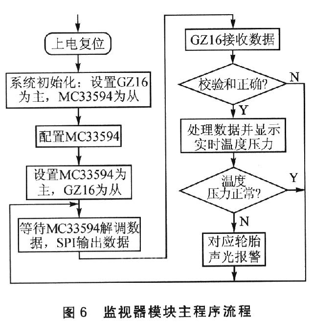 监视器模块的主程序流程如图6所示。GZ16内部的时基模块(TBM)能够产生周期中断。微处理器对收到的各轮胎模块数据进行确认,在每次TBM中断时验证是否收到轮胎模块发来的数据,如果收到就清除报警标志位。当长时间没有收到某轮胎模块的数据时,数据接收超时标志将置位,从而触发报警程序,提醒驾驶员主机不能正常接收该轮胎模块信息。