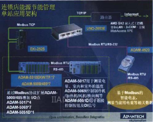 故研华推出整体的节能设备方案。首先利用工业数据采集器(ADAM-5510)将每间店的温度、湿度进行管控,并对于每个设备所耗费的电量进行实时监控,并透过及时的内部以太网络将数据传达至现场的嵌入式工控机(UNO-2053E)。UNO一2053E为一台带有2个LAN,2个RS-232的嵌入式工控机,其无风扇、无转动部件的稳定性,多通讯端口的工业特性,并且内带嵌入式的操作系统(xP embedded)以及功能强大的网络化组态软件(WebAccess)嵌入版,成为客户选择此嵌入式工控机作为此应用的最佳选择,并透过外部网络(远程组态)将这些宝贵的信息传回至该企业的管理中心,进而对每个分店进行数据的分析,而做出对于电量最佳使用的控制。若是发现该店在非营业时间有异常的用电量,则也可透过远程组态下达控制指令将现场的设备进行管控的动作。透过研华成套的解决方案,客户的用电量总共节省了近40%。