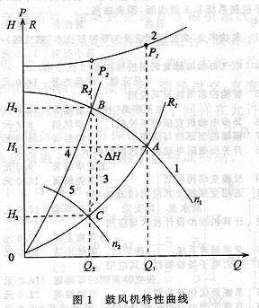 图1中曲线1为风机在恒速下调节风门时的风压-风量(H-Q)特性,曲线2为恒速下调节风门时的功率-风量(P-Q)特性,曲线3为管网风阻(R-Q)特性。假设风机在设计时工作在A点效率最高,输出风量Q1100%。此时,轴功率P1与Q1、H1的乘积面积AH1OQ1成正比(AH1OQ1为耗能),根据生产工艺要求,当风量需从Q1减少到Q2(例如50%风量)时,如采用调节风门的方法调整风量,相当于增加了管网阻力,使管网阻力特性由曲线3变到曲线4,系统由原来的工况点A变到新的工况点B运行,尽管此时风量由Q1减小到Q2,但风压反而由H1增加到H2,轴功率P2与Q2、H2的乘积面积BH2OQ2成正比,功率的减少并不多,可见耗能仍然很大。