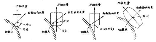 切触点在曲面加工过程中,切削过程中刀具与工件曲面的理论接触点称为切触点。切触点是变化的。从几何学的角度来看,刀具与工件曲面之间的接触关系均为点接触。不同的刀具形状与工件的接触点位置是不一样的,如图。