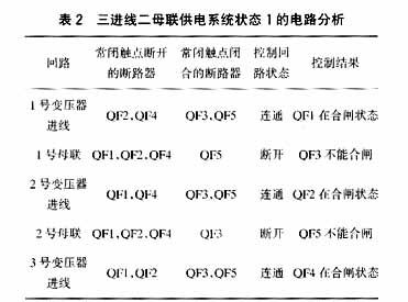 在状态1,即QF1,QF2和QF4合闸而 QF3和QF5分闸时,其电路分析见表2。经过表2分析可知,在状态1时,QF3和QF5不能合闸,此时由1~3号变压器供电。