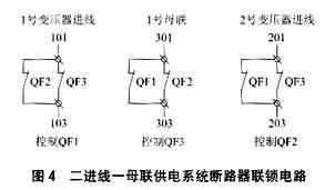 a)三进线二母联供电系统采用三进线二母联供电方式;一般供电系统是采用二进线一母联供电方式,其系统图见图3,联锁电路见图4。