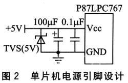 单片机工作电源和系统其他电路电源分开设计,避免其他电路对单片机工作电源产生影响,单片机工作电源设计留有足够的余量,防止电源的波动影响单片机工作。在设计PCB板时,在单片机电源引脚接电容和瞬态电压抑制器(TVS),如图2所示。100 μF电解电容存储的能量在电源波动时(降低)释放出来,保持电源稳定;0.1μF的高频电容可以吸收电源上的高频干扰;TVS吸收瞬态浪涌功率,使两极间的电压箝位于一个预定值,保持单片机工作电源稳定。