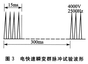由于闪电、接地故障或切换电感性设备而引起的信号参数产生瞬时扰动,产生的高频干扰信号主要是通过系统进线电源进入系统内部。检测这方面的抗干扰能力,主要是通过“电快速瞬变脉冲群抗扰度试验”验证。根据低压电器产品试验标准要求,试验时在供电输入端叠加频率为2 500 Hz,幅度4 000 V的群脉冲,分别进行相线、地线的差模、共模,正极性、负极性试验,每项试验时间均为1 min,群脉冲的波形如图3所示。如果在“电快速瞬变脉冲群抗扰度试验”过程中保护器不产生误动作,则这方面的抗干扰能力就是合格的。
