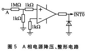 数字采样方法具有数字滤波效果,对信号的通道干扰有抑制作用。设定每个周期采样100个点,由定时器T0产生采样时间间隔。将系统某相进线电源(如A相) 信号经过降压、整形电路如图5所示,转换为方波信号。作为单片机中断0的触发信号,在正常情况下电源信号的频率为50Hz左右,在两次中断期间,对剩余电流的采样次数为100次。