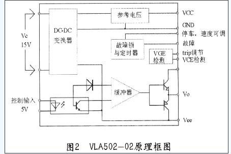 变换器采用脉宽调制的“H”桥拓扑,它由四只IGBT(VT1一VT4)组成。工作时,其输出在1~60μs变化脉冲宽度。IGBT选用三菱公司的CM75BU一12H单相全桥模块,好处是每只IGBT开关特性的一致性好,无须考虑电路的平衡问题。对于驱动电路,目前集成驱动电路很多,由于它直接影响到IGBT可靠工作及可靠保护,经比较选用了POWERXE公司基于VLA502一02的两通道IGBT驱动模块BG2A。图2是VLA502—02的原理图,与常用混合驱动模块另一个同之处是它集成了DC/DC电源,无须再对每个驱动电路单独供电。实际使用表明,BG2A可靠性大大高于EX840等驱动电路,从未遇到过损坏。