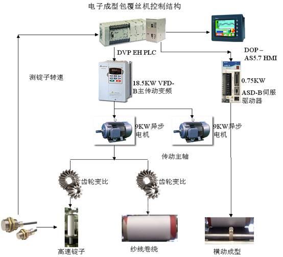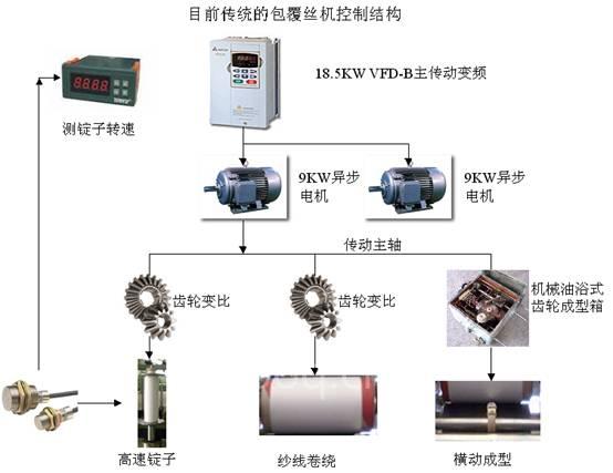 氨纶包覆纱的主体制造设备是包覆丝机。基于台达机电技术的电子成型包覆纱机替代了油浴式齿轮箱,使卷绕成形良好,软边成型退绕更容易,现在的氨纶包覆丝纱锭卷绕成型效果已经等同于国际著名某品牌的包覆丝机的成型效果。