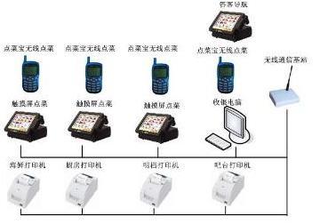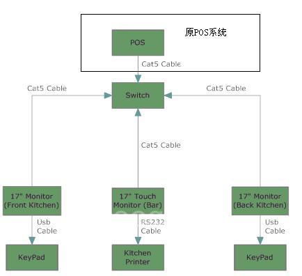 在系统网络拓扑图中,我们不难发现,厨房分前厨(Front Kitchen)和后厨(Back Kitchen) 同时,一般在酒楼的系统中,还存在吧台(BAR),通常作为收费之用。我们的备餐系统分别在后厨和前厨,整个系统通过交换机(SWITCH)和原POS系统相连。
