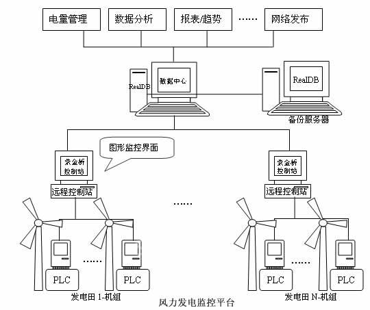 发电田中的所有的涡轮发电机组都连接在同一个局域网中,各个发电机组顶端的控制箱均使用以太网和塔底部的光纤网络连接。该环网与远程控制站相连形成一个冗余环网。远程控制站采用紫金桥前置数据采集软件RealScada实现数据采集和监控,并分析搜集到的数据,从而调整发电机组参数,并向操作人员和维护人员提供报警信息。同时负责将搜集到的数据向上传输到数据中心服务器,实现对全局数据的管理和上层应用。