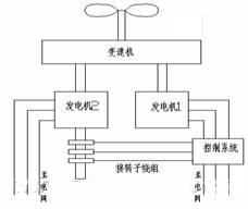 大功率的发电机2只有在风速较大(风机输入功率较大)时才和变速机联接运行。发电机2输出的电流频率不仅和转子的机械转速有关,还和输入转子绕组的电流频率有关,具有将转子的机械旋转频率和转子绕组电路的电流频率“相加”的功能,其定子绕组输出“频率相加”后的电流,这一特点简称为“合频”特性。