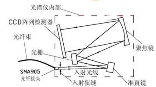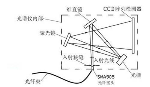 光谱仪微型化设计的实现得益于摄谱结构,最初的光学平台采用对称式Czerny-Turner分光结构[8],荷兰Avantes公司生产的微小型光纤光谱仪即使用了这种光学平台设计(图1所示)。光信号由光纤传导经过一个标准的SMA905接口进入光谱仪内部,经球面镜准直,然后由一块平面光栅分光后,将入射光分成按一定波长顺序排列的单色光,再由聚焦镜聚焦到一维线性CCD线性阵列探测器上进行检测。