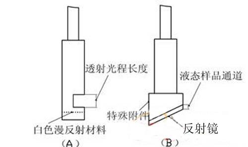 图4-A是透射式浸入探头,在探头末端有一段1mm、2.5mm或5mm的缺口,光通过此物理间隙由底部的白色漫反射材料反射回连接到光谱仪的光纤,信号进入仪器内进行检测。通过把探头浸入或固定在液体中,可在线测量吸收率。图4-B是工业用荧光探头,它在反射式探头末端加装特殊的附件,变为一个45。角的前端视窗,该附件可有效防止周围环境光进入探头,并屏蔽激发光来增强荧光信号。被测液体光程还可在0-5mm之间调节。