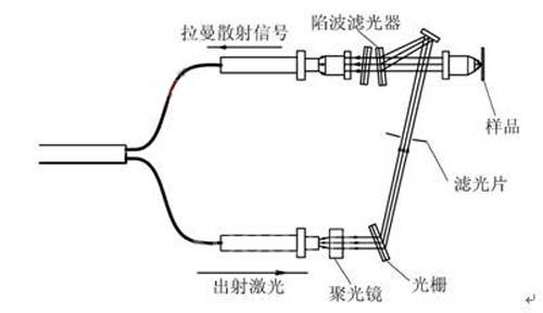 由于拉曼散射信号较弱,受干扰影响大,故用于拉曼光谱测量的光纤探头光路设计较为特别(图5所示)。