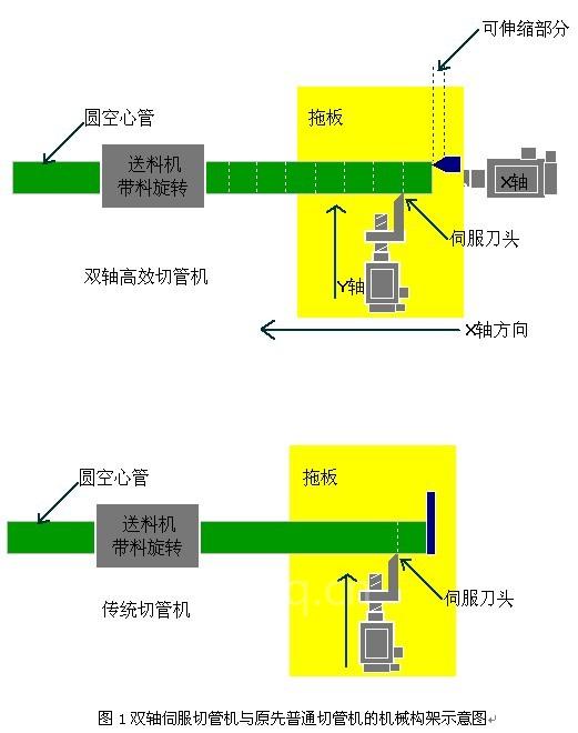 双轴伺服切管机核心的部分是两轴伺服的循环配合动作,一轴为拖板轴向轴,另一轴为切刀切向轴,拖板轴向轴主要是做圈长定位用的,(a)当轴向往管的方向走的时候,当定位传感器碰到管的头部的时候就确认管的位置,进PLC硬件中断,进行脉冲禁止,然后再根据切管的长度做一个补偿定位;(b)定位完毕切向切刀进行切管,切管完毕;轴向继续前进重复a,b的动作,直至切到管子送料的末端,也就是极限位置,轴向退回,然后送料,送料完毕,重复a,b动作,这就是双轴伺服切管的最基本的动作流程。双轴伺服切管机与普通切管机的机械构架如图1所示。