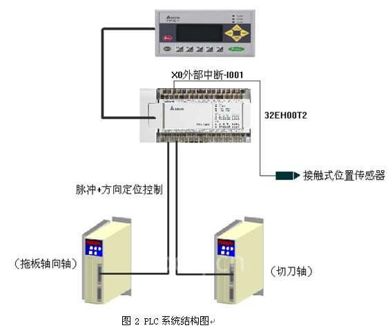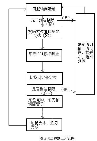 由于使用了双轴伺服控制,所以方案中使用的是32EH00T2型PLC主机做定位控制,同时利用中断方式来实现轴向定位的切换。由于使用的是接触式传感器(X0)外部中断来做脉冲禁止,然后切换到长度定位,同时使用的是丝杆传导,所以精度问题可以保证(0.1mm以内),具体的PLC系统如图2所示;控制工艺流程如图3所示。