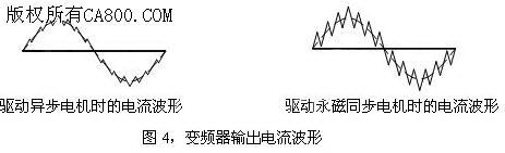 由于永磁同步电机的内部等效气隙要比异步电机大得多,因此永磁同步电机有比异步电机小得多的主电感和电气时间常数,这在控制上有电流响应快的好处,但是变频器通常是被设计为驱动大电感量的异步电机的,如被用于驱动永磁同步电机,变频器的输出电流纹波将比驱动异步电机时的电流纹波大得多。