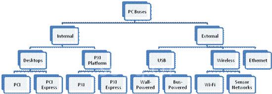 图1将这些总线按由NI数据采集产品组成的PC-总线体系架构的方式组织展示,从内插式到可热插拔的外部总线。