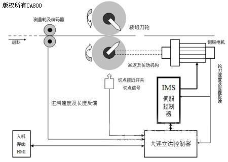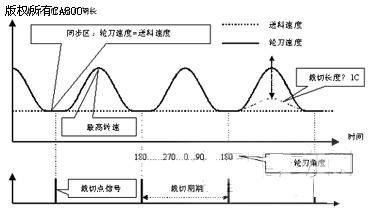 2. 经过运动控制系统精确的计算、控制,在裁刀速度上升到一定值之后,立刻开始减速;务求在裁刀速度下降到与进料速度同步的同时,裁切刀轮也恰好进入同步区域;并维持同步直到第二个裁切点出现,乃完成一次裁切循环。