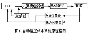 恒压供水控制系统的基本控制策略是:采用电动机调速装置与可编程控制器(PLC)构成控制系统,进行优化控制泵组的调速运行,并自动调整泵组的运行台数,完成供水压力的闭环控制,在管网流量变化时达到稳定供水压力和节约电能的目的。系统的控制目标是泵站总管的出水压力,系统设定的给水压力值与反馈的总管压力实际值进行比较,其差值输入CPU运算处理后,发出控制指令,控制泵电动机的投运台数和运行变量泵电动机的转速,从而达到给水总管压力稳定在设定的压力值上。