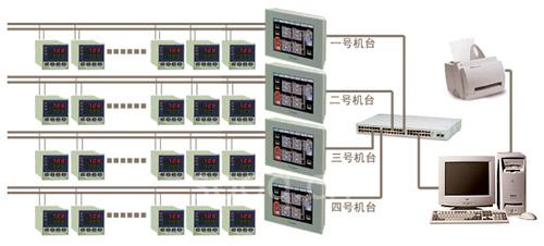 系统结构图如下 : 测控系统 整个测控系统包括AI-2000触摸屏电脑、AI调节器、铂电阻PT100、SSR固态继电器、电加热管。 触摸屏电脑选用宇电AI-2000工业级触摸屏电脑(TOUCH PC),不仅可运行WINDOWSCE 、LINUX等各种嵌入式操作系统及软件,也可运行WINDOWS 98等PC操作系统及软件,应用丰富灵活,能全面取代无纸记录仪、人机界面等产品。显示屏采用10.4英寸TFT真彩色液晶屏幕,配合触摸式屏幕操作,显示画面直观清晰,操作简便。同时采用CF电子盘,解决了普通硬盘不耐震动的问题,可应用于工业现场。具有一个RS232通讯接口、1个RS485通讯接口,1个并行打印口、1个USB接口、1个PS/2鼠标接口,1个键盘接口、1个RJ45以太网口。 触摸屏电脑中安装有宇电工控组态软件AIFCS产品,用户无需系统组态即可直接使用,该软件与宇光仪表配套使用共同构成智能仪表现场总线系统,本工程与该软件配套的仪表有AI708、AI708M,共90个通道。触摸屏电脑上的并行口还可以直接和打印机连接实时或定时打印当前或历史数据。利用触摸屏中电脑内置的RS485通讯口与AI708、AI708M温控表直接通讯。通讯方式RS485;仪表采用AIBUS通讯协议,8个数据位,1个或2个停止位,无校验位,数据采用16位求和校验,它的纠错能力比奇偶校验高数万倍,可确保通讯数据的正确可靠。 温控仪表选用宇电具有通讯功能的AI系列仪表,该仪表采用AI人工智能调节方式,是利用模糊规则进行PID调节的一种新型算法,在误差大时,运用模糊算法进行调节,以消除PID饱和积分现象,当误差趋小时,采用改进后的PID算法进行调节,并能在调节中自动学习和记忆被控对象的部分特征以使效果最优化,具有无超调,高精度,参数确定简单,对复杂对象也能获得较好的控制效果等特点。其整体调节效果比一般PID算法及模糊调节算法均更优越。 主要功能描述 本系统由上位机(工业极触摸屏电脑)和下位机(宇光AI智能仪表)二层结构组成:上位机负责对现场设备连接的所有智能仪表的数据进行监控、处理和辅助控制;下位机(宇光AI智能仪表)负责对现场设备的数据采集并控制现场设备的正常运行。