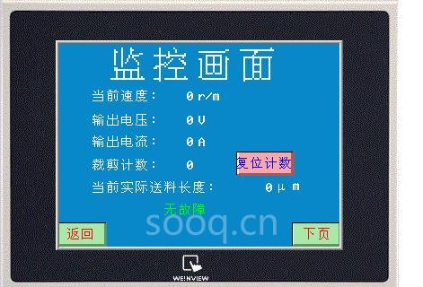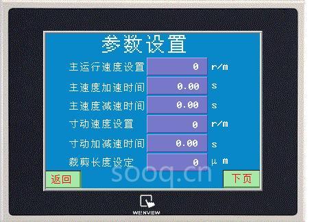 采用WEINVIEW的人机界面MT506MV随时可以在触摸屏上根据需要设定不同的裁剪长度以及裁剪速度的快慢。其操作界面如下图所示: