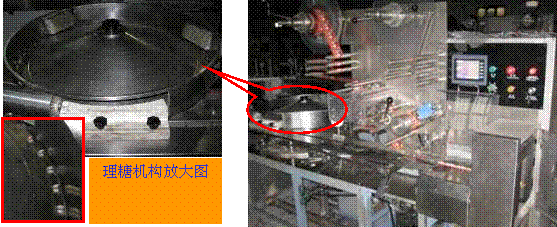 糖果经圆形盘整理后,进入直线链钩机构,被链钩送进包装膜内,然后进行纵封和横封包装,以完成成品裁切。具体结构如图1所示
