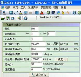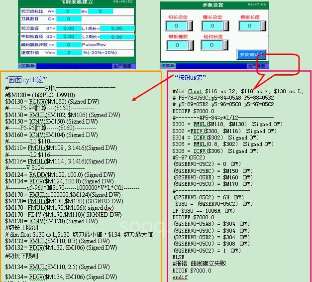 ASD-A2伺服控制器飞剪曲线的建立,除了利用PC软体所提供的ECAM EDITER建立外,还提供更加便捷的曲线建立方式,即HMI飞剪曲线建立功能。其HMI规划如图,用户只需在装机时将设备机械结构参数输入HMI,通过HMI宏指令便可控制伺服控制器实现飞剪曲线的建立,如需生产规格变更,用户只需输入裁切长度,飞剪曲线便可自动变更。