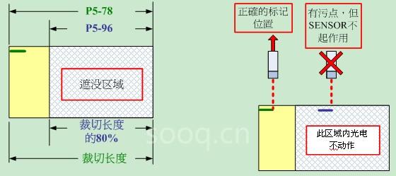A2伺服控制器内建色标遮没功能,可有效避免包装膜污染,色标错印所引起的光电误动作,增加了整个系统的稳定性。如图13所示;P5-78为裁切长度的脉冲设定值,P5-96为遮没区脉冲长度,此功能设定后,在遮没区域内,即使色标误动作,也不会影响到整个系统的性能。