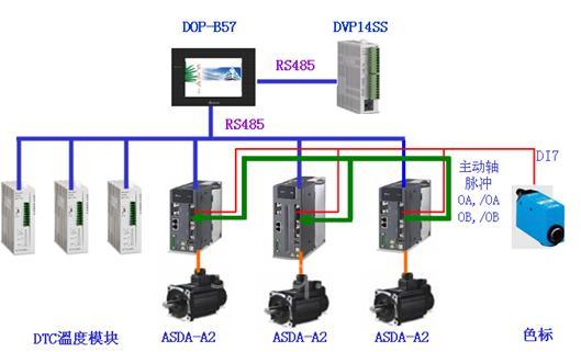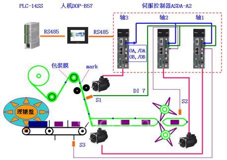 台达系统解决方案,为了满足高速的要求,送膜、送料链钩、切刀三个轴均使用伺服控制,三轴之间的运动控制依据凸轮主从关系完成,整个系统控制方案如图5所示