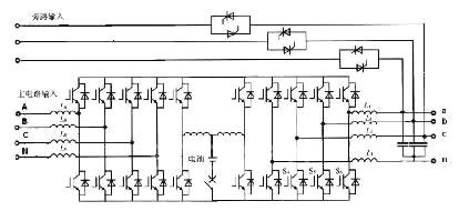 高频机通常由IGBT高频整流器,电池变换器,逆变器和旁路组成。IGBT可以通过控制加在其门极的驱动信号来控制IGBT的开通与关断,IGBT整流器开关频率通常在几kHz到几十kHz,甚至高达上百KHz,相对于50Hz工频,称之为高频UPS。典型的高频机拓扑如图4所示。