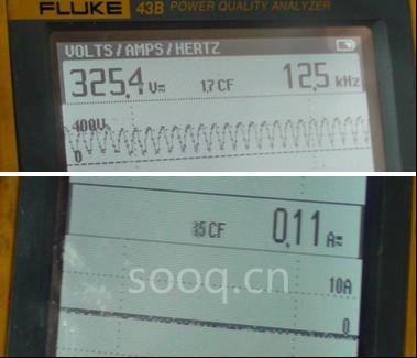 可以明显看到频率12.5kHz的高频分量,实测电池正极与大地浮置电压为325V,断开电池架接地,电池架与大地间有大于100V的浮置电压。接通电池架与大地,电池架与大地漏电流高达110mA(见图6)。按照行业标准(GB13870.1-93《电流通过人体的效应》),50mA的电流就可以致人死亡。该型号UPS在电池架未与大地短接时,人体触摸到电池架有明显被电击的感觉。原因是充电回路中高频分量通过人体与大地形成通路,造成人体触电。同时,此高频谐波严重干扰了外置的UPS电池单体电压监控系统,使电池电压监控测试仪无法正常工作。