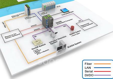 Moxa IA260有8+8 路DI/DO控制on/off开关系统、入侵检测及报警灯光系统。另外,某些DI/DO可保留以备后续使用。双LAN端口(一个固定IP,一个可配置端口)允许数据从PLC向以太网交换机传输数据,然后交换机将数据传送至SCADA系统。另外,一个紧凑闪存插槽和额外串行接口(4个串行端口)可用于以后的存储扩展及使用。