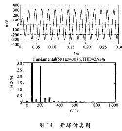 建立Simulink系统仿真模型,仿真模型设置仿真时间0.3s,并选择变步长的odel5算法,在输入电压为48V,负载为额定负载情况下,启动仿真可得其输出波形,输出电压波形图和THD频谱图如图14和图15所示。