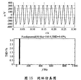 从频谱分析上可以看出,开环时,总谐波系数(THD)为3.O2%,且三次谐波含量比较大。闭环时,总谐波系数(THD)为0.07%,谐波含量非常少。从电压波形上可以看出,开环时电压输出波形在第3个周期才达到稳定,而闭环时在第2个周期就达到了稳定,所以闭环时电压达到稳定值的速度比开环时要快。