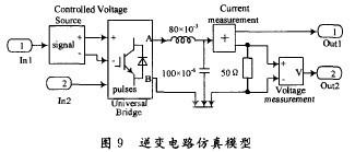 图2中各子模块的仿真模型如图3~图10所示。该系统的仿真参数为:直流升压电路仿真参数设置:工作频率为f=20 kHz;变压器变比 k=13;输出滤波L=8μH,C=300μF。全桥逆变电路仿真参数设置:工作频率f=25kHz,输出滤波L=80mH,C=100μF。这里设置相应仿真参数进行仿真调试。